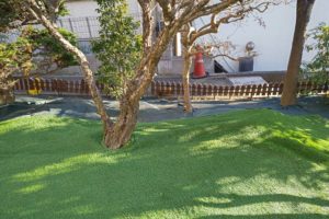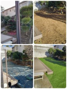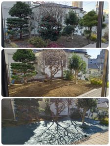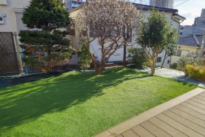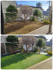 お庭の一部を人工芝にして、その他の土の部分は防草シートを敷設しました。